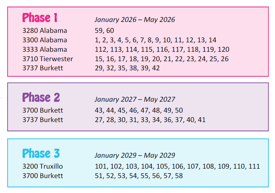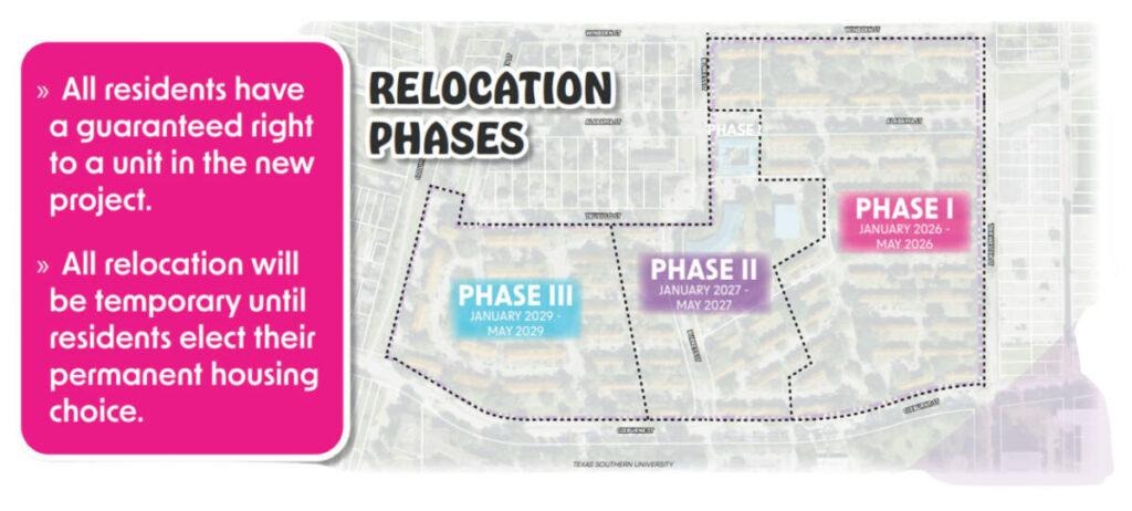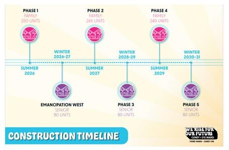 The Houston Housing Authority is moving forward with the redevelopment of Cuney Homes as part of the Third Ward Choice Neighborhood Initiative. Guided by years of community input and the strategies outlined in the Transformation Plan submitted to the U.S. Department of Housing and Urban Development, HHA and Brinshore Development are implementing a build-first, phased construction plan designed to modernize the community while prioritizing resident stability and minimizing disruption. This page provides a clear overview of the relocation and construction timelines — what will happen, when it will occur, and how HHA will support residents throughout each phase of the process.