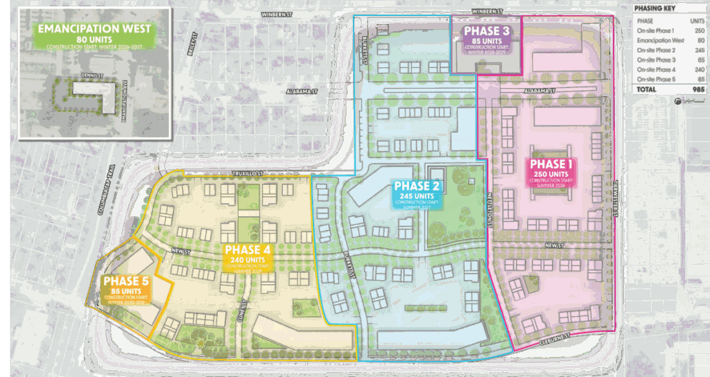 The map below shows where each construction phase will occur across the Cuney Homes site.